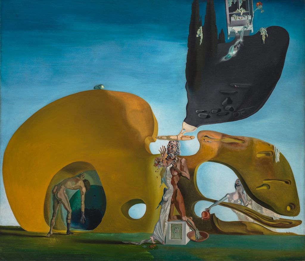 Dominująca biomorficzna struktura zdaje się jednocześnie przypominać skrzypce, zerodowane skały, wizjonerską architekturę Antoniego Gaudíego, rzeźby Hansa Arpa, prehistorycznego potwora i paletę malarską. To hybryda znaczeń, przestrzeń zawieszona pomiędzy realnością a snem. Centralna postać zdradza napięcie między winą a pragnieniem, wyrażone w geście zarazem sprzeciwu i pożądania wobec zakazanej kobiety o głowie-kwiecie — najpewniej samej Gali.