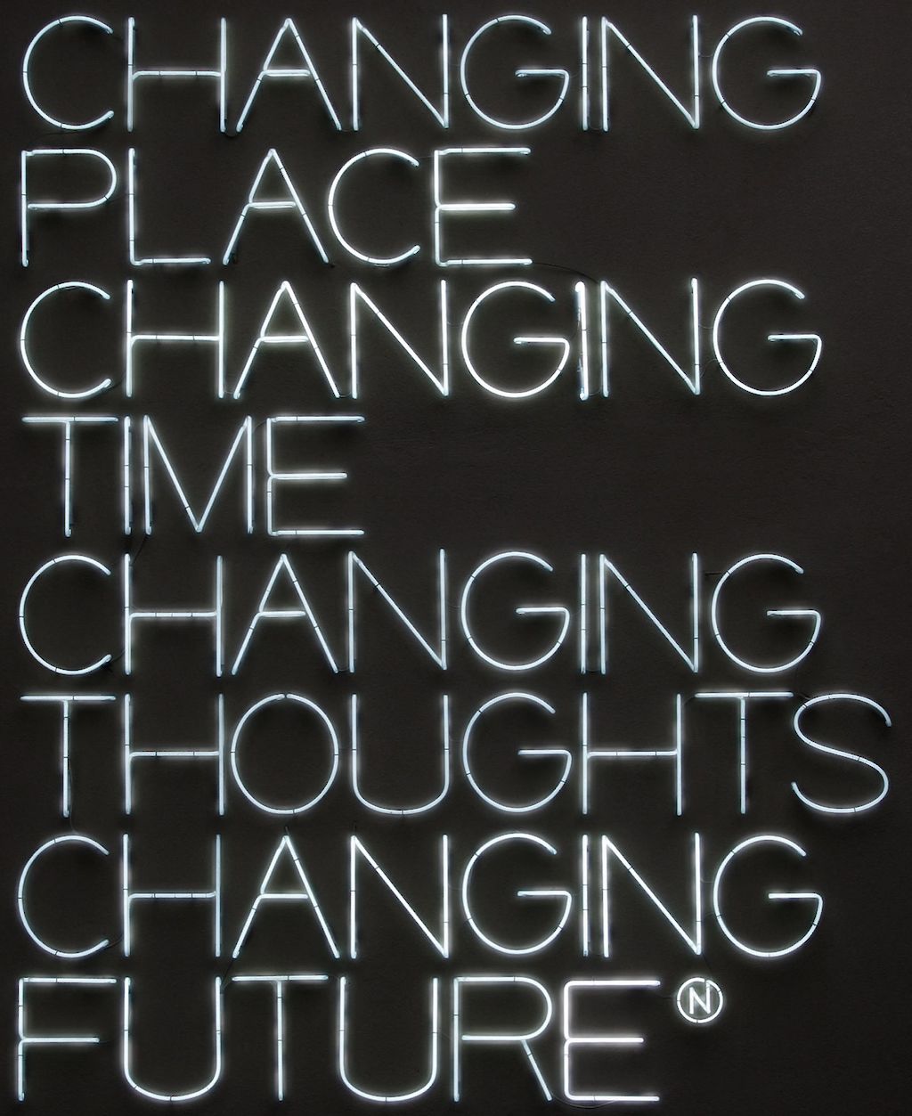 Nannucci, artysta, który od lat bada relację między językiem, obrazem, przestrzenią i światłem, tym razem zaprasza nas do stania przed elementem minimalistycznym, a zarazem bogatym: słowa umieszczone w przestrzeni — neon i ciemność — stają się obietnicą możliwości. „Changing Place” — zmieniające się miejsce; „Changing Time” — czas w ruchu; „Changing Thoughts” — myśli, które nieustannie przekształcają się; „Changing Future” — przyszłość jako otwarta perspektywa, któa nie jest dana raz na zawsze, lecz kształtowana przez teraźniejszość.